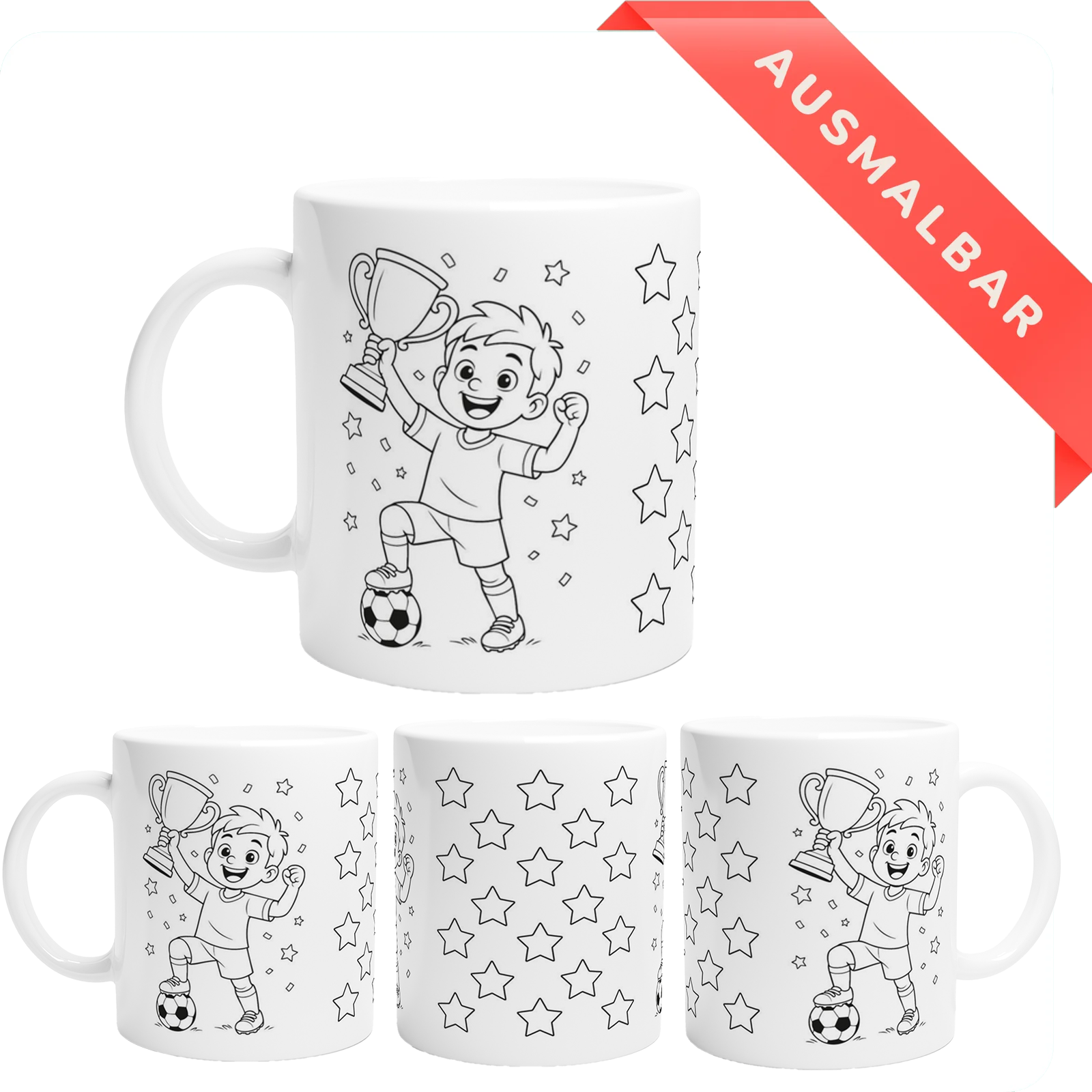 - Ausmalbare Tasse mit Fußballspieler, Pokal und Sternen