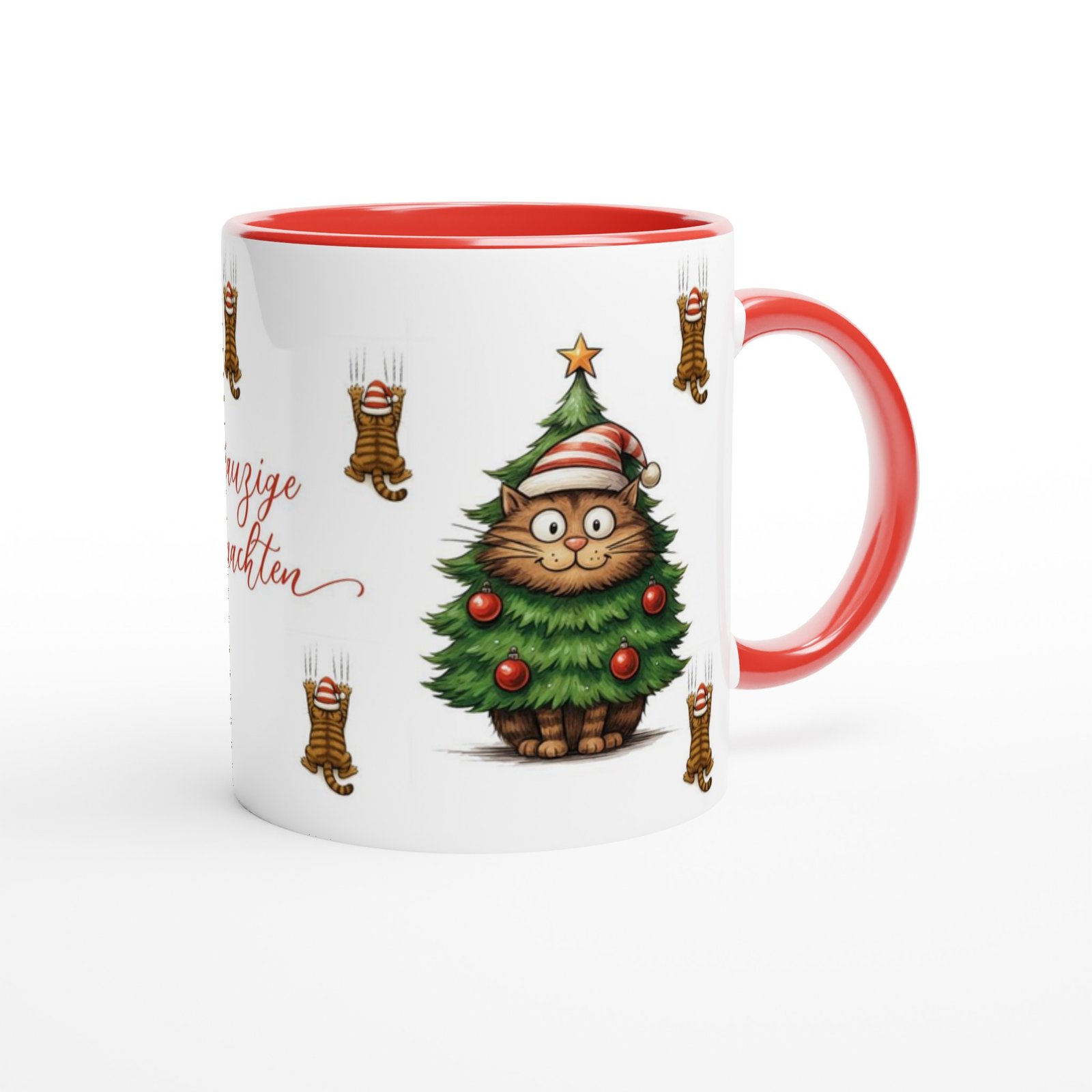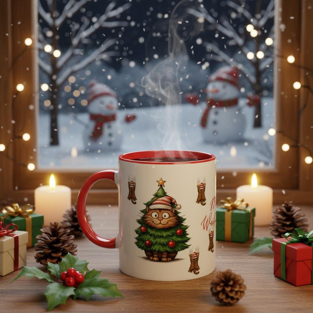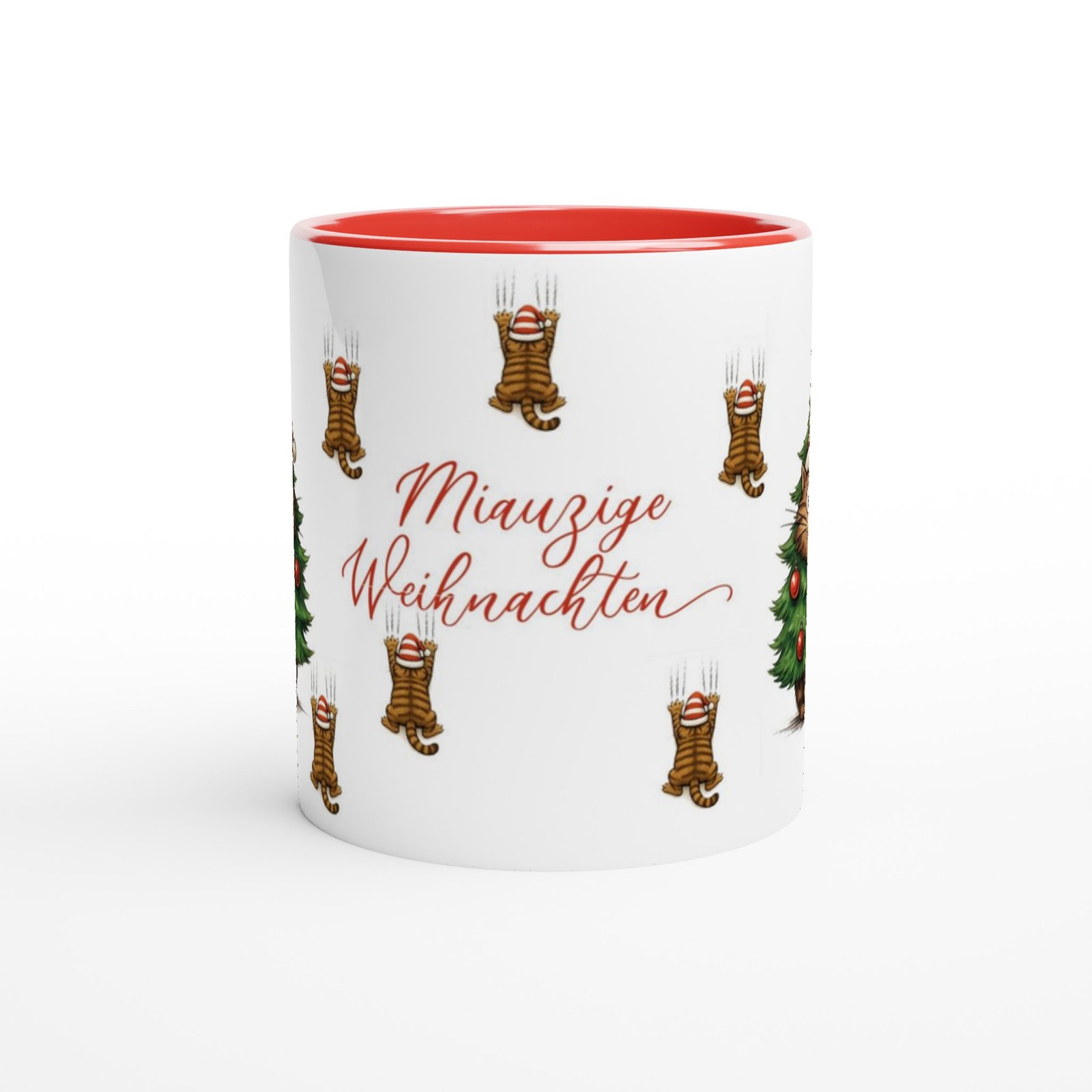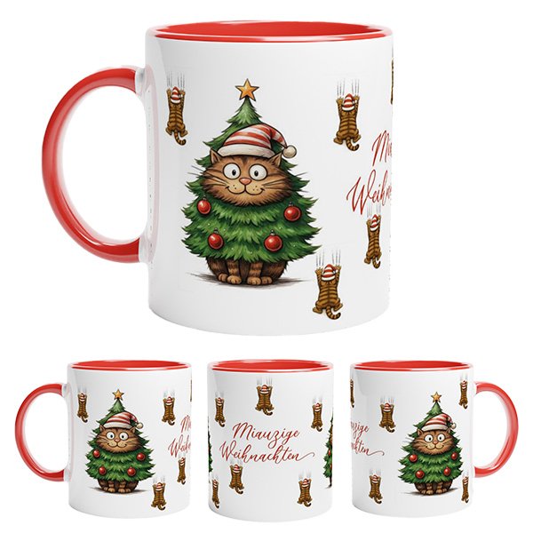 Auf den Seiten der Tasse steht der Schriftzug „Miauzige Weihnachten“, der den Festtagsgruß mit einem charmanten Katzenspiel verbindet. Die Innenseite der Tasse ist in einem schicken Rot gehalten, was dem weihnachtlichen Look den letzten Schliff verleiht.