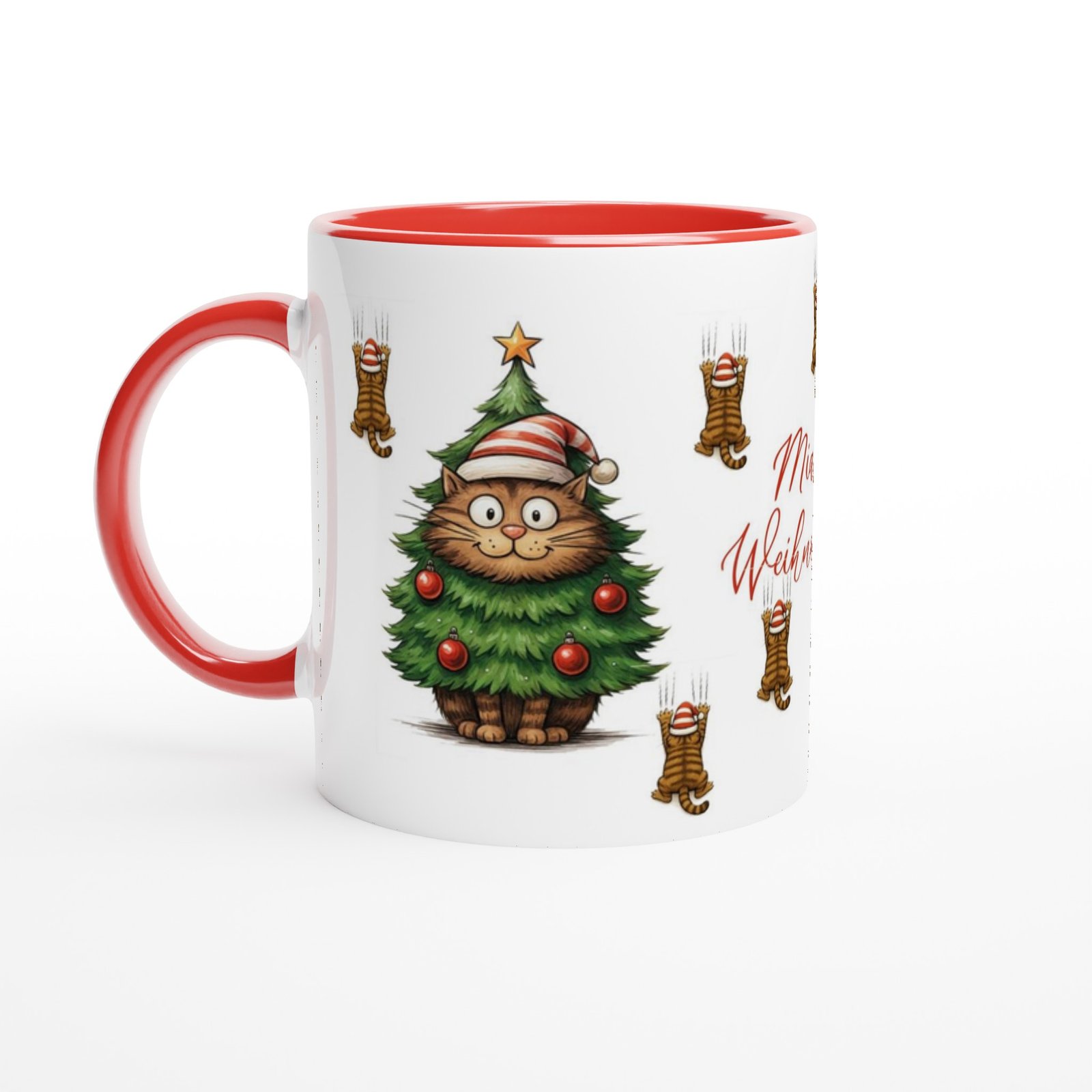 Diese liebevoll gestaltete Weihnachts-Tasse ist das perfekte Geschenk für Katzenliebhaber und alle, die es festlich-humorvoll mögen! Das Highlight des Designs ist ein süßer Kater, der sich als geschmückter Weihnachtsbaum verkleidet hat – komplett mit roten Kugeln, lustiger Mütze und einem Stern auf der Spitze. Rundherum ergänzen kleine Illustrationen einer sich festkrallenden Katze das weihnachtliche Motiv und sorgen für ein zusätzliches Schmunzeln.