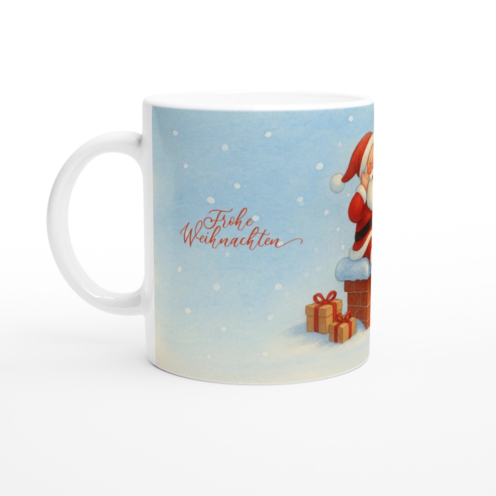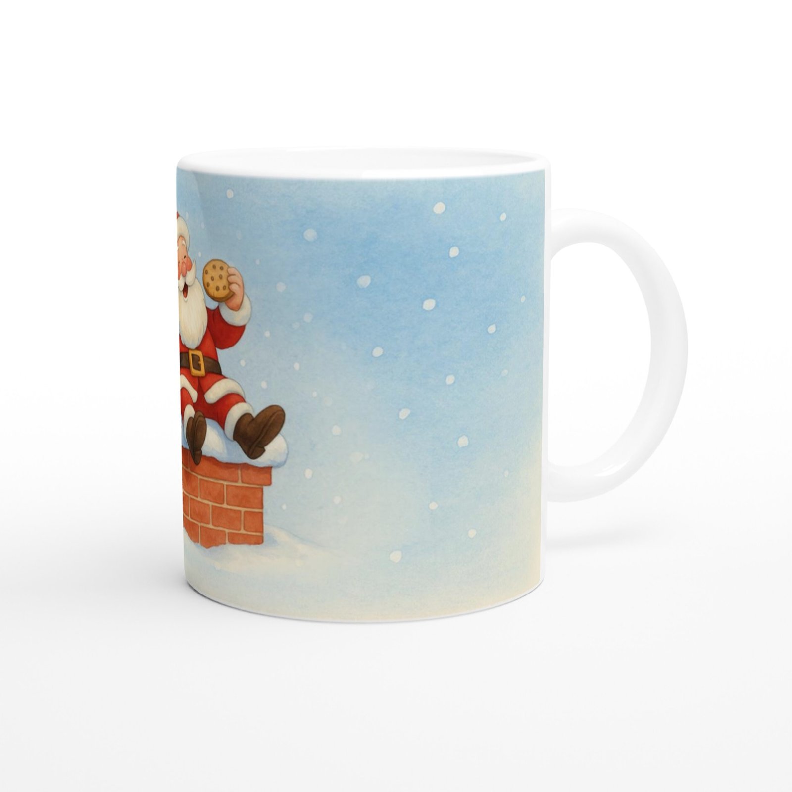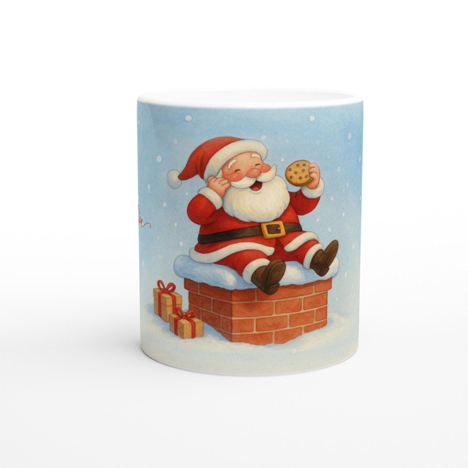 Diese liebevoll gestaltete Weihnachtstasse bringt sofort festliche Stimmung in deine Hände! Das große Motiv zeigt einen fröhlichen Weihnachtsmann, der gemütlich auf einem verschneiten Schornstein sitzt, genüsslich einen Cookie nascht und über beide Backen strahlt. Um ihn herum fallen zarte Schneeflocken, während neben dem Schornstein hübsch verpackte Geschenke warten – einfach pure Weihnachtsfreude!